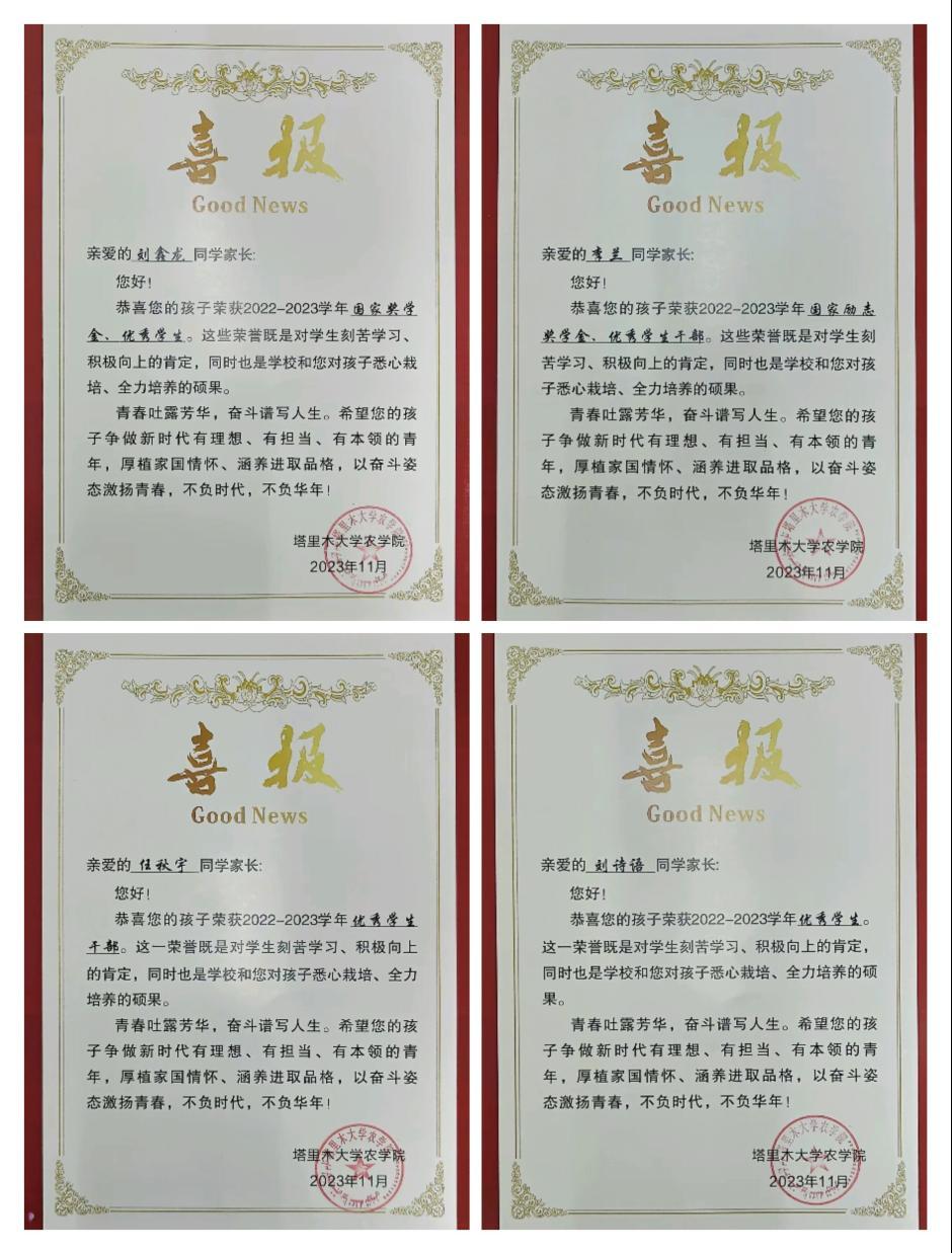 为发挥榜样力量,勉励优秀学生,加强家校联动,形成育人合力。农学院以“喜报”的形式将2023年秋季学期国家奖学金、国家励志奖学金、优秀学生以及优秀学生干部荣誉寄送至学生家长。据统计,我院本年度国家奖学金获得者2名、国家励志奖学金获得者48名、优秀学生称号获得者135名、优秀学生干部称号获得者105名,其中同时荣获两项荣誉的学生有34名,共计邮出喜报254份。