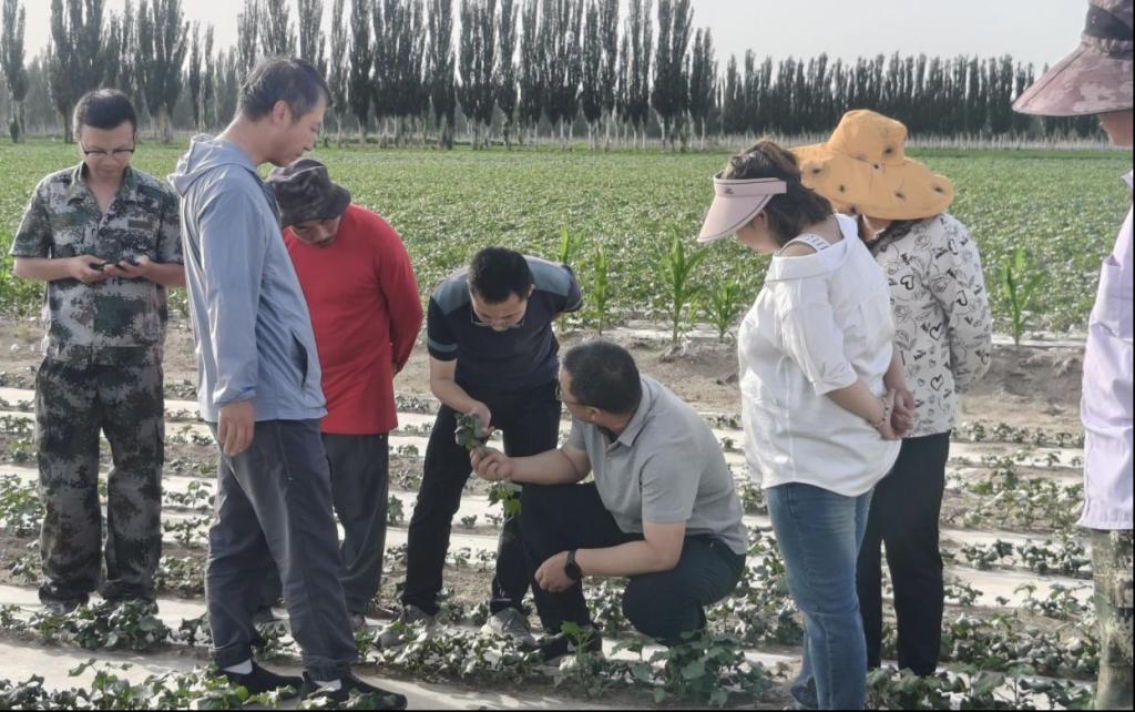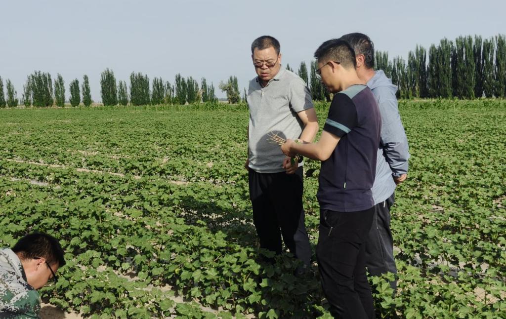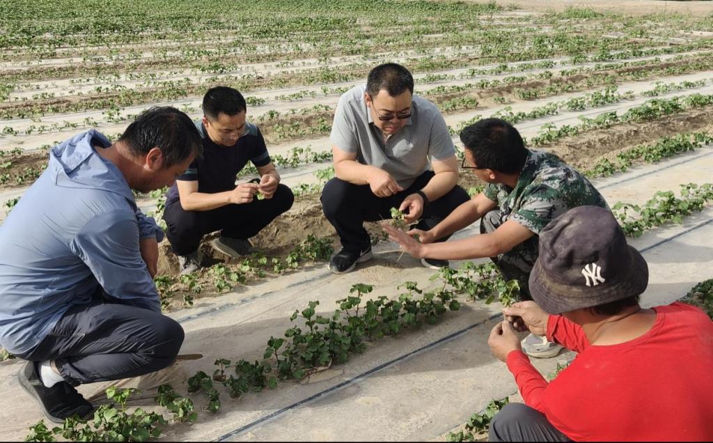 2024年6月5日,受8团11连连长廖雷寻求棉花药害诊断与种植技术援助。我校罗新宁教授、柳维扬教授、肖海兵副教授以及植物保护23级学生对该连棉花受到药害的情况进行实地考察及分析,对棉田进行诊断和实施挽救策略,减少职工们的经济损失,用科学技术推动农业发展。