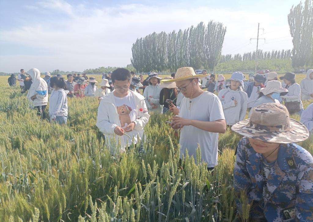 在金丰源种业有限公司小麦育种试验基地,学生们在田间观察小麦亲本熟期、抗病性、倒伏等特性。