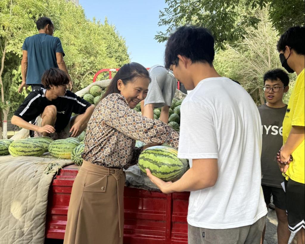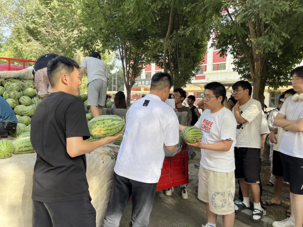 活动伊始,西瓜装运车抵达学校,学院师生一同卸载西瓜、流水搬运。为了让我院学子第一时间品尝到西瓜,学院师生分工合作,从排队登记、到自己选瓜井然有序。万素梅代表学院党委为同学们送去夏日问候和备考祝福,欢声笑语此起彼伏,驱散了学生由于天气和考试所带来的燥热,为这炎热的夏日增添了一抹清凉。