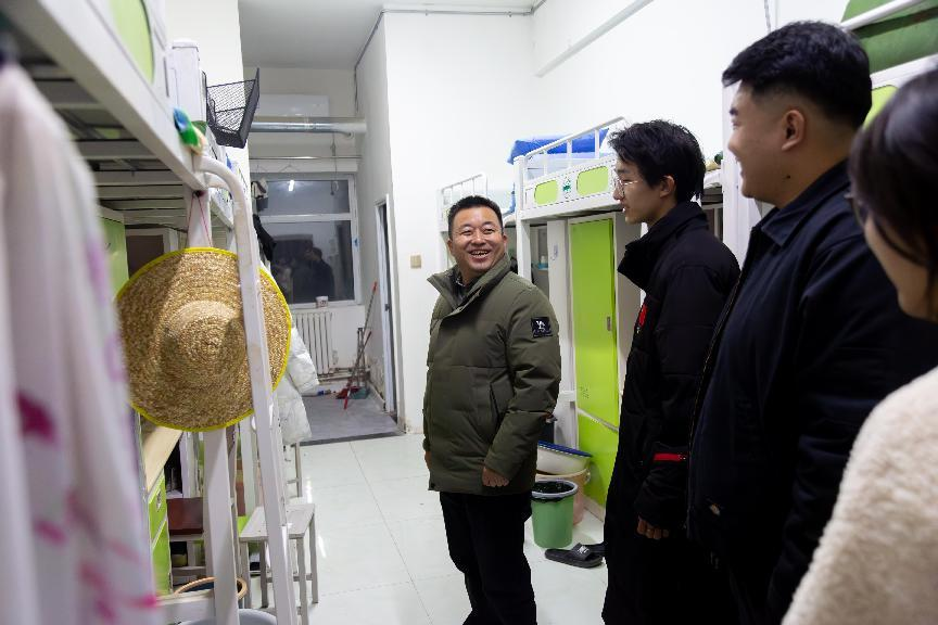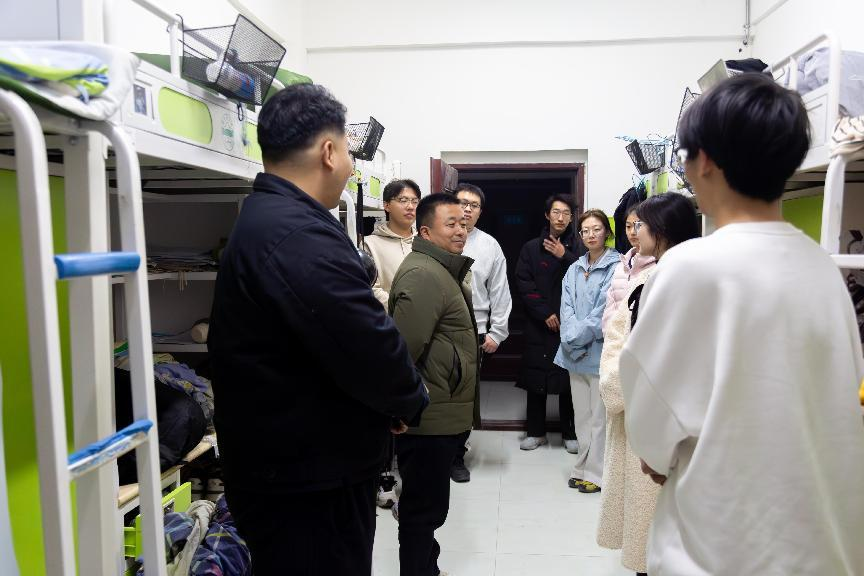 走访中,翟云龙院长与同学们亲切交谈。院长详细询问了大家寒假结束后的适应情况,了解同学们新学期的学习计划和目标。同时,仔细检查宿舍卫生和设施状况,提醒同学们注意用电安全,保持良好的生活环境。