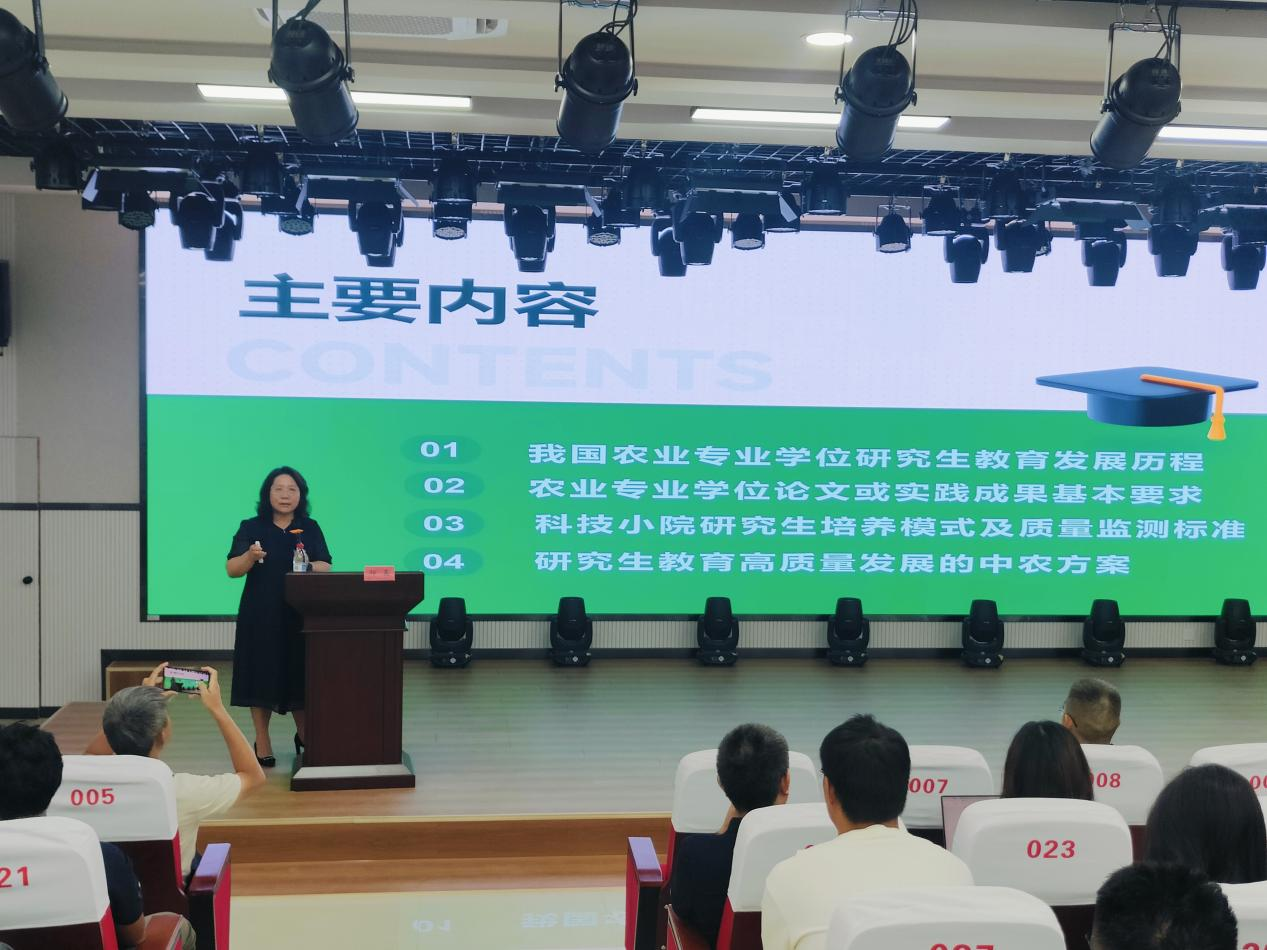 郭鑫教授从我国农业专业学位研究生教育发展历程、农业专业学位论文或实践成果基本要求、科技小院研究生培养模式及质量检测标准、研究生教育高质量发展的中农方案四个方向进行了汇报。她在报告中指出,面对农业现代化的新要求,农业人才培养必须坚持质量为先,勇于创新突破。她重点分享了“解民生•治学问•育英才”全国科技小院交流的成功经验,指出该模式将科学研究、人才培养与社会服务深度融合,是培养知农爱农高层次应用型人才的有效途径。