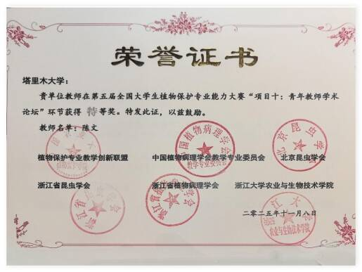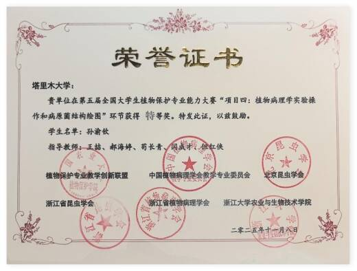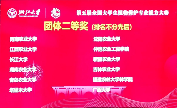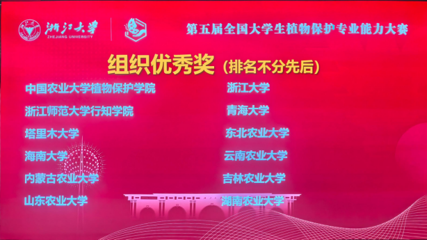 11月7日—9日,第五届全国大学生植物保护专业能力大赛在浙江大学成功举办。我校农学院王兰教授受邀担任大赛评委,农学院王喆老师带领12名师生参加大赛。经过激烈角逐,我校胡杨学子在王喆、郝海婷、闫成才、苟长青、陈文等老师的精心指导下,凭借扎实的专业功底、出色的创新能力和良好的团队协作精神,在激烈竞争中脱颖而出,共斩获特等奖2项、一等奖1项、二等奖2项、三等奖5项,创下我校在该项赛事中的历史最佳成绩!其中,特等奖与一等奖实现零的突破。综合团队整体优异表现,我校还荣获团体二等奖与优秀组织奖。