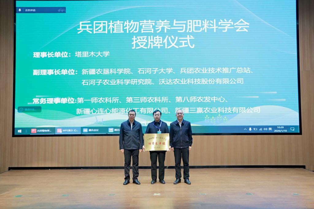 会上,塔里木大学被授予学会理事长单位,兵团科技局党组成员、科协常务副主席吕学强与新疆农垦科学院党委副书记、院长周平共同为我校授牌。全体会员通过无记名投票,选举我校支金虎教授为学会第四届理事会理事长。这是我校第一次被选举为省级学会理事长单位,象征着我校农业资源与环境学科在疆内的学术影响力取得了重大突破。