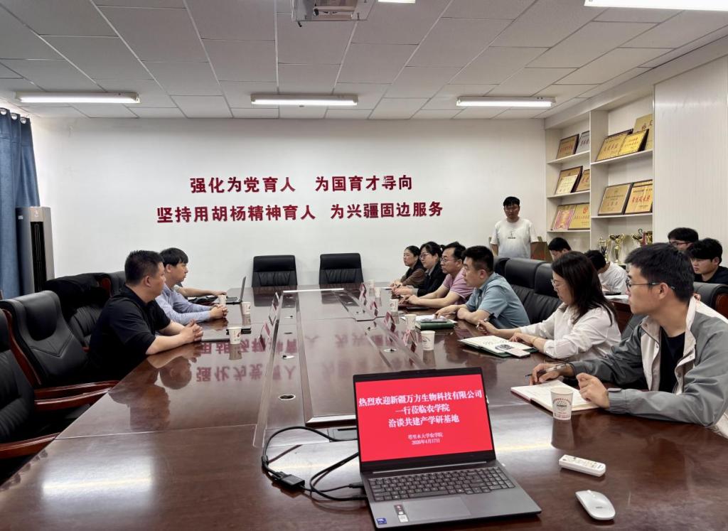 4 月 17 日下午 5 时,新疆万方生物科技有限公司付彦江一行莅临我院交流座谈,我院党委委员、副院长陈国栋主持会议,学院教师代表与学生代表一同参与,双方在农科楼227会议室进行深入交流,就共建产学研基地事宜进行深入洽谈。
