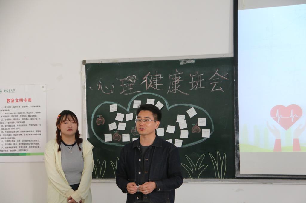 班会以一首轻松的音乐拉开序幕。首先,管燕辉从常见的心理疾病类型着手,就大学生群体中常见的心理疾病进行了详细介绍,并强调“患病不可耻,寻医不丢人”的观点。管燕辉在黑板上画下一棵“烦恼收集树”,请老师和每一位同学将自己的烦心事及压力写在便利贴并粘贴在“烦恼收集树”,然后逐个进行分析和劝导。