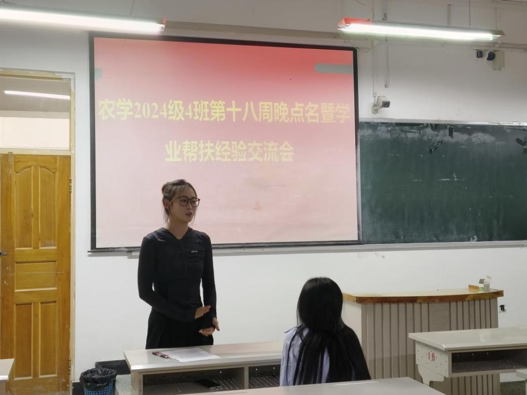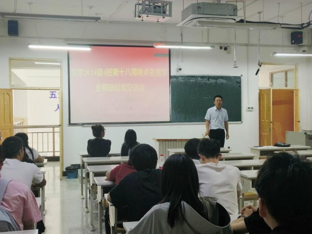 为增强学生安全意识,营造优良学风,助力学业提升,农学2024级4班于6月29日在综合楼413教室开展了第十八周晚点名暨学业帮扶经验交流会。班主任崔政军老师、驻班党员宫艺及班级全体同学参加。