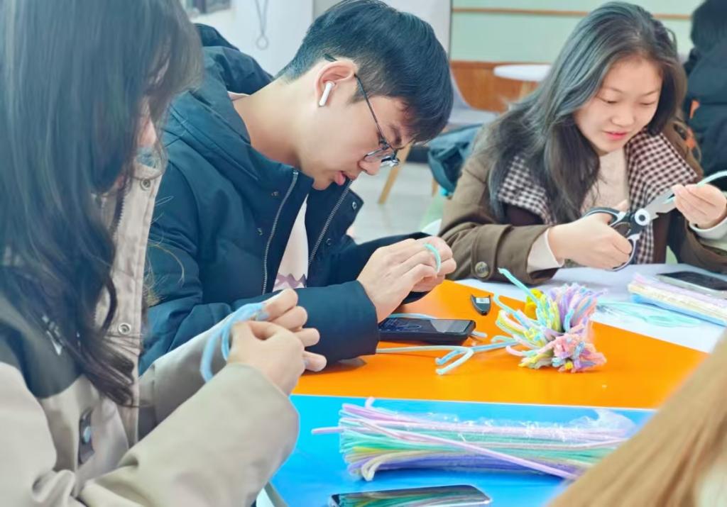 2025年12月14日下午,学院心理健康部组织的以“协作与成长”为主题的第三次团辅活动在东区17号学生公寓楼一楼大厅“良耜家园”新农人共享交流区顺利开展,活动以趣味扭扭棒创作为载体,带领学生在弯折、拼接的手工过程中梳理心绪、舒缓焦虑,百变的造型激发无限灵感,吸引大批学子热情参与,现场氛围活泼又治愈,创意与暖意交织绽放。