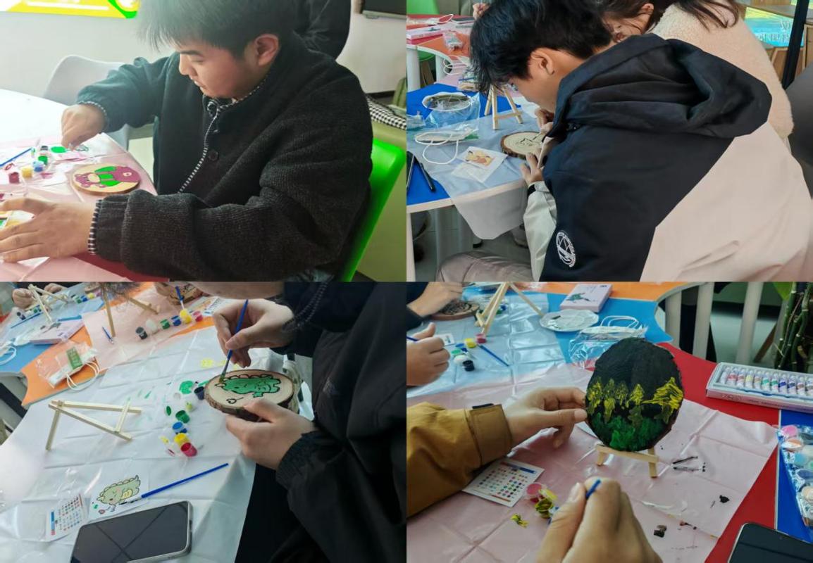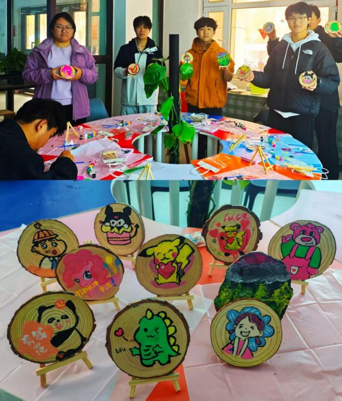 活动伊始,负责人向同学们介绍了木片画创作的注意事项。同学们围坐桌前,提笔细细勾勒,将自己心中所想慢慢晕染在木片的年轮纹理间。可爱生动的卡通形象、富有意境的自然风景等,每一幅作品都独一无二。大家自由挥洒色彩与灵感,在专注地绘制时刻里释放情绪,探索自我,绘出独一份的真实心境。