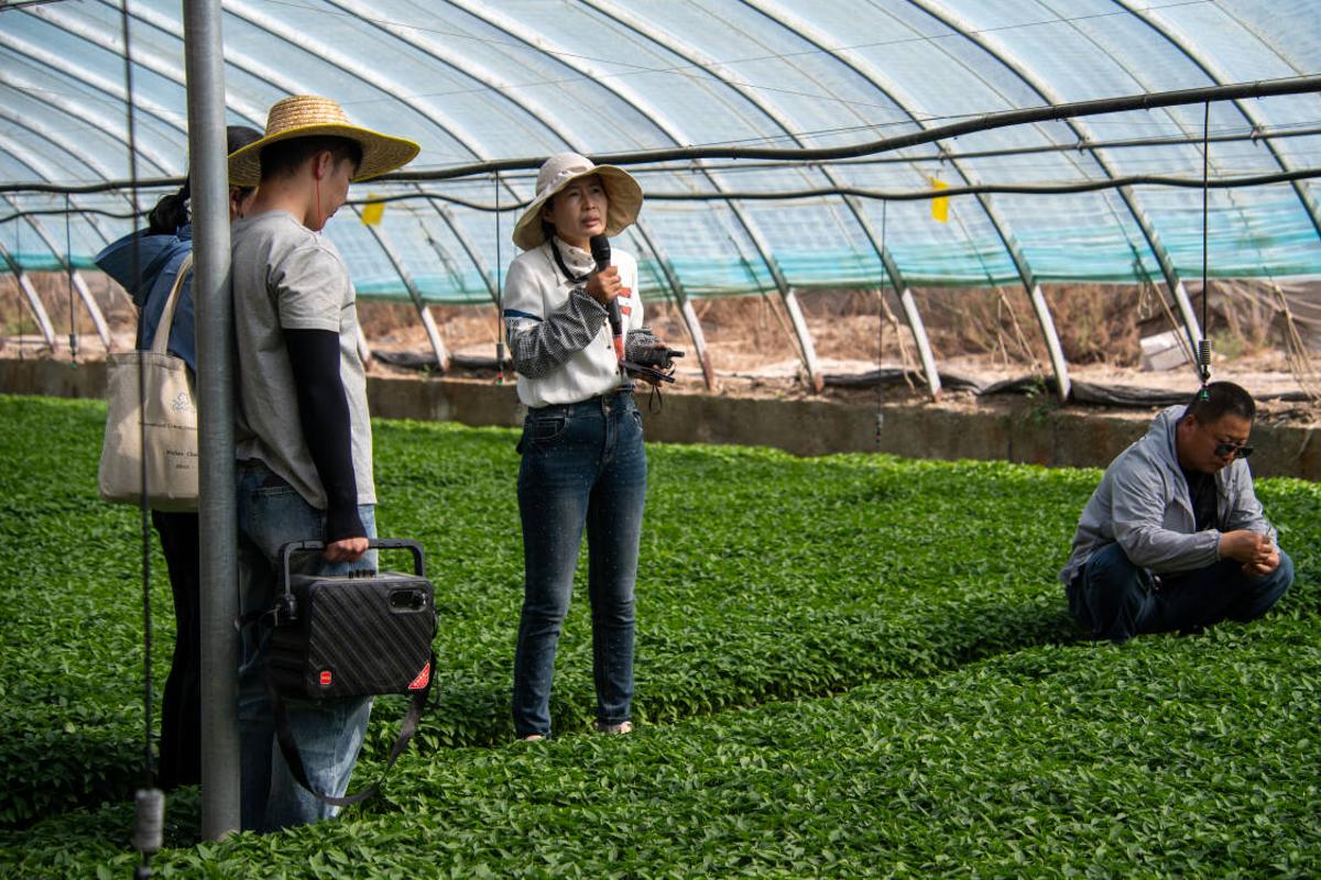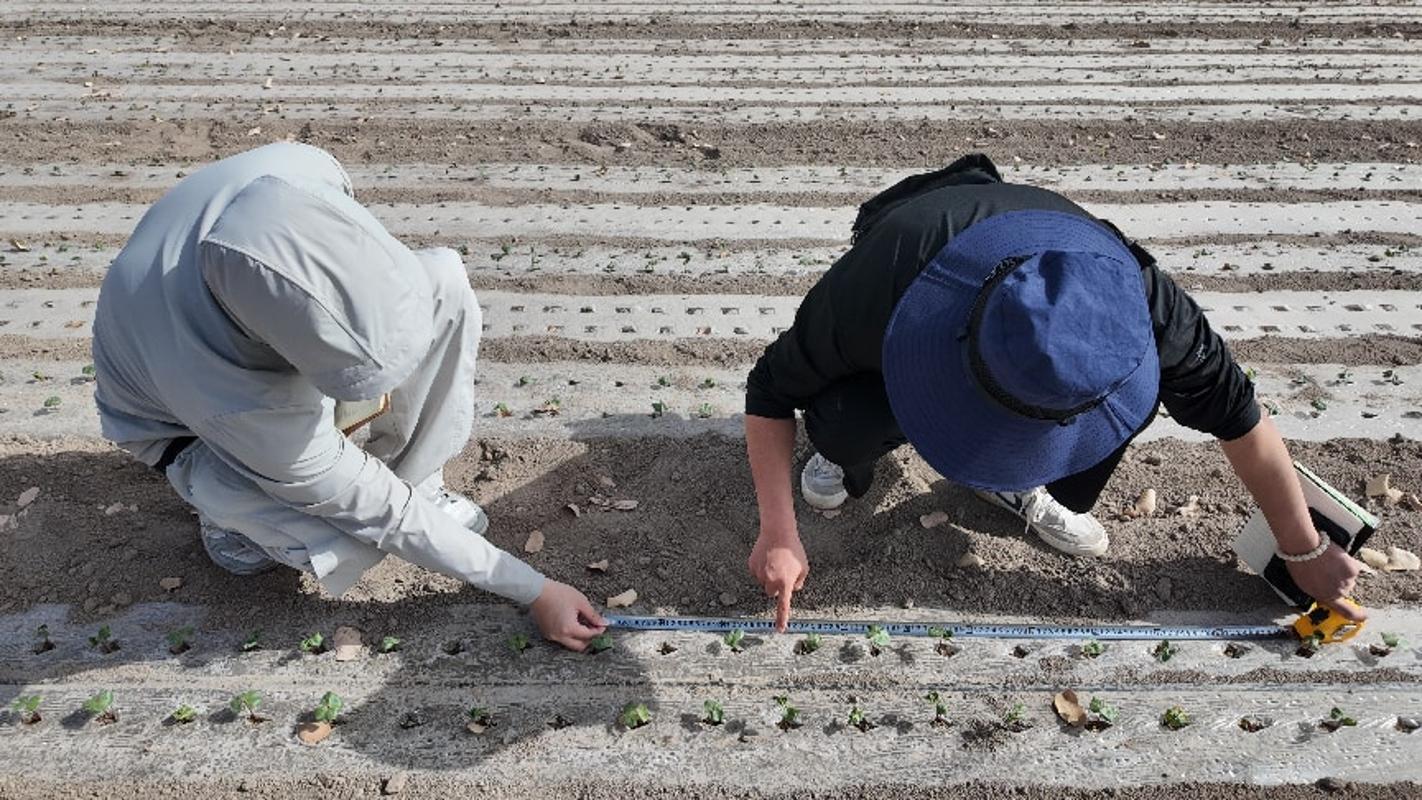 下午第一站,师生来到十三连食葵种植地,十三连党支部书记、指导员张韶华围绕选种、播种密度、水肥管理及花期调控等关键技术讲解,介绍当地首次尝试头茬种植食葵、计划收获后复种二茬食葵的模式与高产经验,让同学们掌握食葵规模化种植与田间管理要点。接着来到十三连朝天椒移栽现场,张韶华就株行距把控、定植技巧、缓苗及田间管护细致讲解,介绍朝天椒在南疆种植优势。随后前往朝天椒育苗基地,专业技术人员王海霞围绕辣椒育苗关键技术开展专项讲解,从育苗基质配比、种子预处理、温湿度管控、幼苗炼苗管理等方面,细致讲解辣椒育苗的全流程技术。