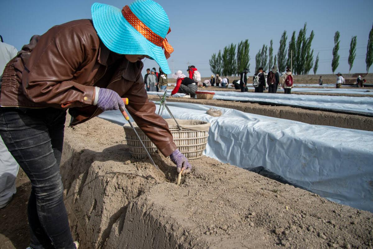 师生一行先后前往七团各连队特色农业示范点。在四连芦笋种植区与棉花种植区,四连党支部书记、指导员余超现场讲解。余超结合作物当前生长情况,详细介绍种植模式、苗期管理及田间管护技术,与师生现场交流探讨。大家走进田间驻足观摩芦笋采收,直观了解“避光培育、精细采收”的核心要点。在十四连水稻育秧田,十四连党支部副书记、连长王文勇(塔里木大学农学2012届2班)为大家现场讲解。王文勇依托自身农学专业优势,系统介绍水稻育秧全流程,重点讲解现代化育秧技术应用及科学肥水管理经验。师生还来到五连7-5北干泵(兵团科学施肥增效示范区),实地学习科学施肥、减量增效、节水灌溉等绿色生产技术,深切感受到现代农业科技在提升产能、保护耕地中的重要作用。