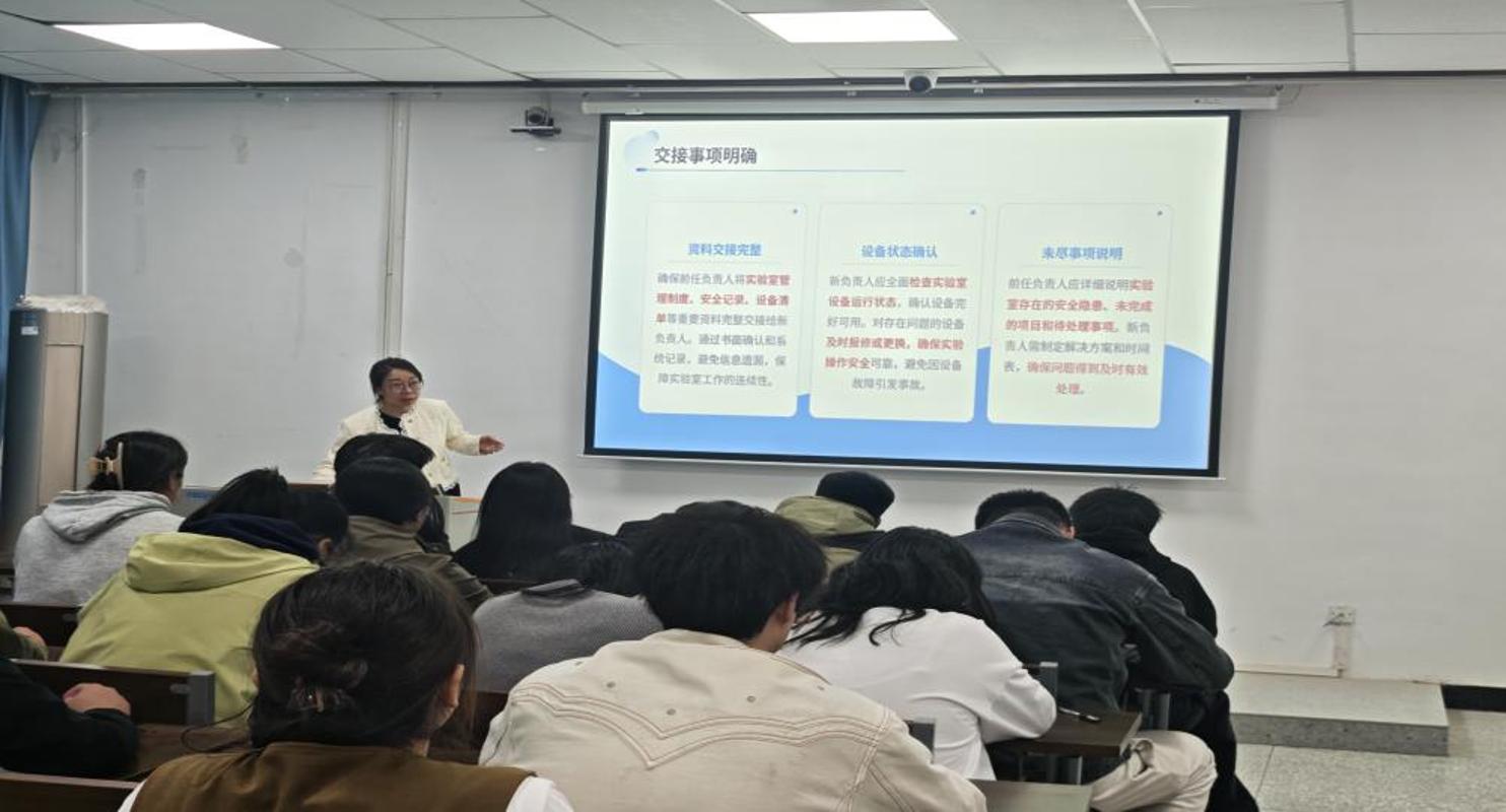 期间,刘倩老师从实验室安全制度执行,实验操作规范,危险品管理,事故原因探究等方面明确新老实验室管理员交接事项。同时,多层面,多维度对各实验室管理员进行安全培训。