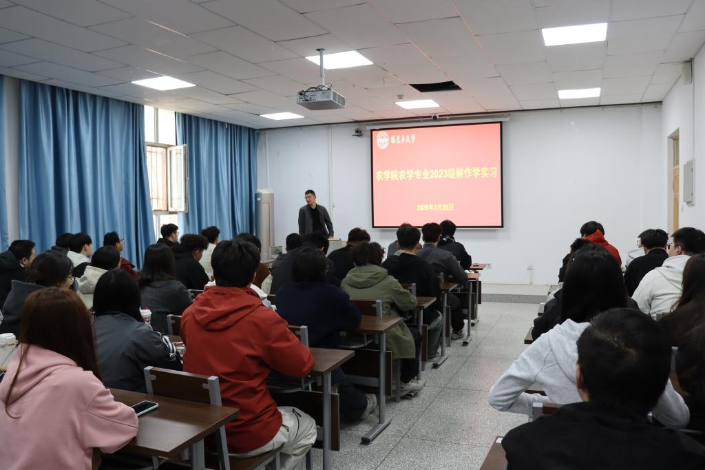 实习第一天,全体学生在农科楼121教室开展集中教育,由曹楠、胡强、毛廷勇、祁炳琴、刘倩、龚平、曹耀等实习老师主持。老师们详细解读实习流程、安全规范及专业要求,明确田间实操、技术观测等实践内容,强调农具使用、田间防护等安全要点,结合过往案例讲解实习重难点解决方法,引导学生认识实习的重要意义。